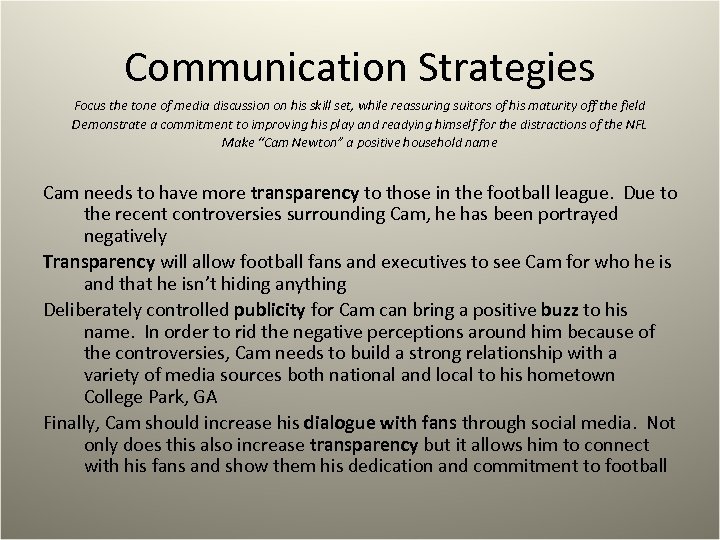 Communication Strategies Focus the tone of media discussion on his skill set, while reassuring suitors of his maturity off the field Demonstrate a commitment to improving his play and readying himself for the distractions of the NFL Make “Cam Newton” a positive household name Cam needs to have more transparency to those in the football league. Due to the recent controversies surrounding Cam, he has been portrayed negatively Transparency will allow football fans and executives to see Cam for who he is and that he isn’t hiding anything Deliberately controlled publicity for Cam can bring a positive buzz to his name. In order to rid the negative perceptions around him because of the controversies, Cam needs to build a strong relationship with a variety of media sources both national and local to his hometown College Park, GA Finally, Cam should increase his dialogue with fans through social media. Not only does this also increase transparency but it allows him to connect with his fans and show them his dedication and commitment to football