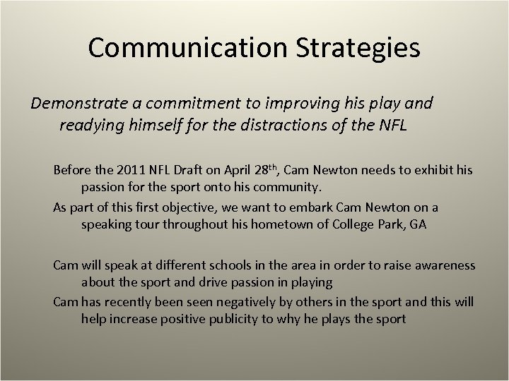 Communication Strategies Demonstrate a commitment to improving his play and readying himself for the distractions of the NFL Before the 2011 NFL Draft on April 28 th, Cam Newton needs to exhibit his passion for the sport onto his community. As part of this first objective, we want to embark Cam Newton on a speaking tour throughout his hometown of College Park, GA Cam will speak at different schools in the area in order to raise awareness about the sport and drive passion in playing Cam has recently been seen negatively by others in the sport and this will help increase positive publicity to why he plays the sport