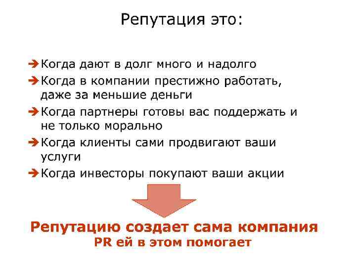 REPUTATION: An Overview Reputation is a collective term referring to all stakeholders’ views of corporate reputation, including identity and image Professor Gary Davies –Manchester Business School Репутация - это собирательный термин, обозначающий мнения всех заинтересованных сторон, корпоративной репутации, в том числе, личность и образ Reputation = experience – expectations репутация = опыт - ожидания 12
