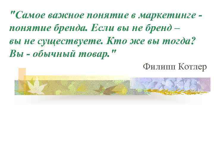 "Самое важное понятие в маркетинге понятие бренда. Если вы не бренд – вы не существуете. Кто же вы тогда? Вы - обычный товар. " Филипп Котлер