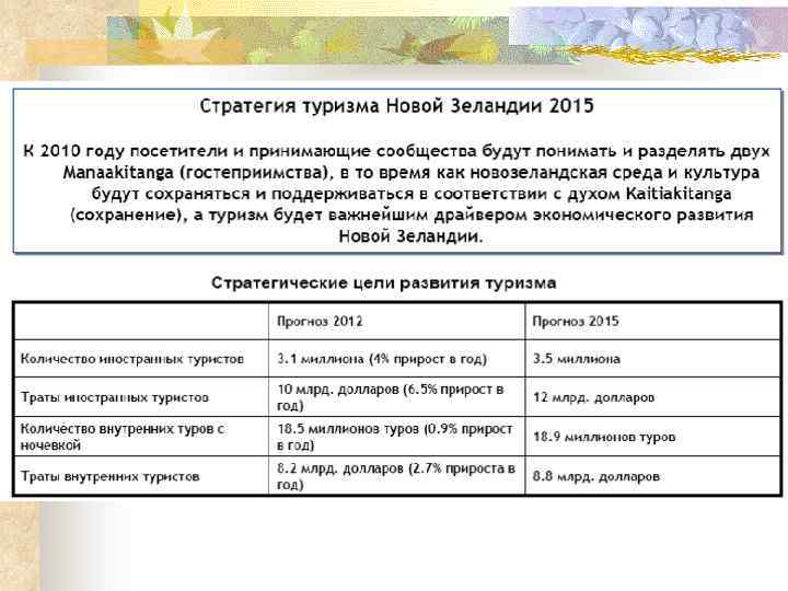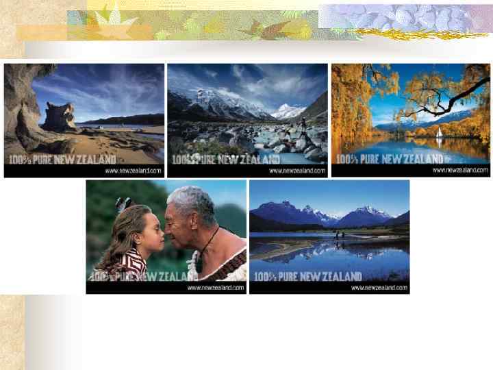100% Pure. New Zealand. n n n Новая Зеландия – самая удаленная от Старого Света страна мира и самая молодая с геологической точки зрения. Новая Зеландия – рай экологического (множество уникальный экосистем) и этнографического туризма. Основные конкуренты – Австралия, Канада, Южная Африка, Ирландия. Новая Зеландия – страна, где овец больше, чем людей. Туризм – крупнейшая (наряду с сельским хозяйством) отрасль экономики страны и крупнейший работодатель. В 2005 г. Новую Зеландию посетили 2. 5 миллиона иностранных туристов, потративших 6. 5 миллиардов долларов США.