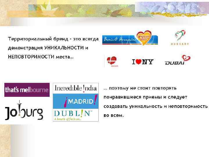 Предпосылки для развития брендинга территорий n Территории во все времена выстраивали свою политику интуитивно на основе маркетинговых технологий. Взглянув на историю средневековья, мы обнаружим, что нации и их правители стремились обрести те или иные атрибуты – привлечь кафедру архиепископа, чтобы увеличилось количество паломников, открыть университет, чтобы приезжало больше студентов и ученых, и т. д. Целью всех этих мероприятий было увеличение возможностей для совершения различных сделок на территории – между городом и компаниями, между городом и жителями, между компаниями и жителями, между жителями и посетителями и т. д. n Сегодня дифференциация становится важной не только для товаров и услуг, но и для территорий. Вопросы целевых аудиторий… – «Почему мне лучше жить здесь, а не в другом месте? » – «Почему я должен инвестировать в бизнес в этом месте? » – «Почему я должен искать партнеров здесь? » – «Почему мне интересно провести отпуск в этом месте? » . … требуют ясного ответа n n n