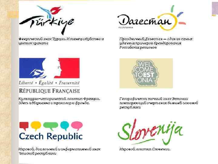 n n n Нельзя быть известным для всех стран (важны стратегические страны: соседи, экспорт, туризм, инвестиции) Нельзя иметь одинаковый имидж для различных целевых групп (инвесторы, туристы, жители региона, экспортные потребители) Но они должны сочетаться, дополнять друга и создавать синергетический эффект