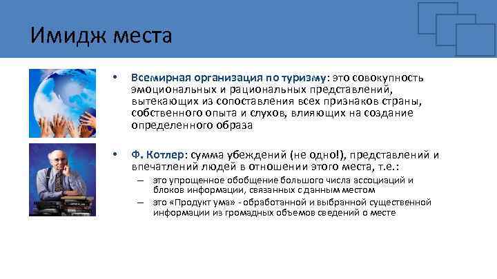 Имидж места • Всемирная организация по туризму: это совокупность эмоциональных и рациональных представлений, вытекающих из сопоставления всех признаков страны, собственного опыта и слухов, влияющих на создание определенного образа • Ф. Котлер: сумма убеждений (не одно!), представлений и впечатлений людей в отношении этого места, т. е. : – это упрощенное обобщение большого числа ассоциаций и блоков информации, связанных с данным местом – это «Продукт ума» - обработанной и выбранной существенной информации из громадных объемов сведений о месте
