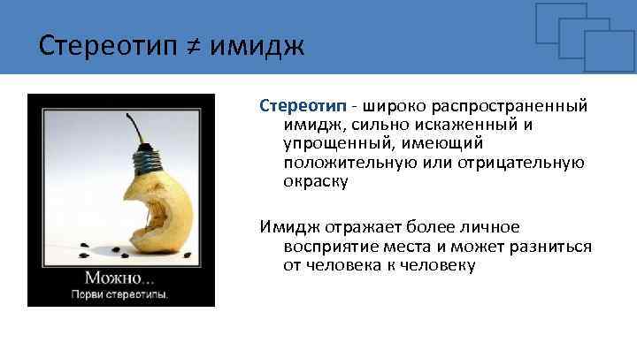 Стереотип ≠ имидж Стереотип - широко распространенный имидж, сильно искаженный и упрощенный, имеющий положительную или отрицательную окраску Имидж отражает более личное восприятие места и может разниться от человека к человеку