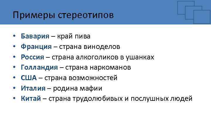 Примеры стереотипов • • Бавария – край пива Франция – страна виноделов Россия – страна алкоголиков в ушанках Голландия – страна наркоманов США – страна возможностей Италия – родина мафии Китай – страна трудолюбивых и послушных людей
