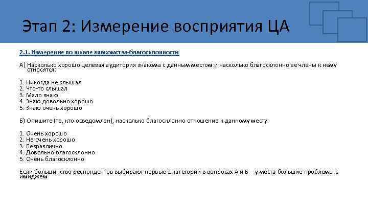 Этап 2: Измерение восприятия ЦА 2. 1. Измерение по шкале знакомства-благосклонности А) Насколько хорошо целевая аудитория знакома с данным местом и насколько благосклонно ее члены к нему относятся: 1. Никогда не слышал 2. Что-то слышал 3. Мало знаю 4. Знаю довольно хорошо 5. Знаю очень хорошо Б) Опишите (те, кто осведомлен), насколько благосклонно отношение к данному месту: 1. Очень хорошо 2. Не очень хорошо 3. Безразлично 4. Довольно благосклонно 5. Очень благосклонно Если большинство респондентов выбирают первые 2 категории в вопросах А и Б – у места большие проблемы с имиджем