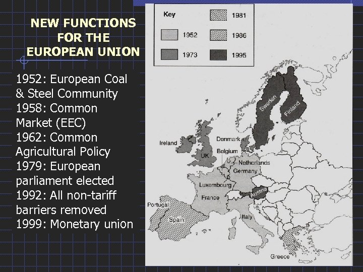 NEW FUNCTIONS FOR THE EUROPEAN UNION 1952: European Coal & Steel Community 1958: Common Market (EEC) 1962: Common Agricultural Policy 1979: European parliament elected 1992: All non-tariff barriers removed 1999: Monetary union