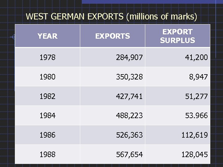 WEST GERMAN EXPORTS (millions of marks) YEAR EXPORTS EXPORT SURPLUS 1978 284, 907 41, 200 1980 350, 328 8, 947 1982 427, 741 51, 277 1984 488, 223 53. 966 1986 526, 363 112, 619 1988 567, 654 128, 045