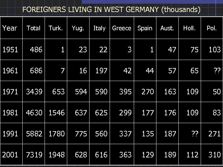 FOREIGNERS LIVING IN WEST GERMANY (thousands) Year Total Turk. Yug. Italy Greece Spain Aust. Holl. Pol. 1951 486 1 23 22 3 1 47 75 103 1961 686 7 16 197 42 44 57 65 ? ? 1971 3439 653 594 590 395 270 163 109 50 1981 4630 1546 637 625 299 177 176 109 83 1991 5882 1780 775 560 337 135 187 ? ? 271 2001 7319 1948 628 616 363 129 189 112 310