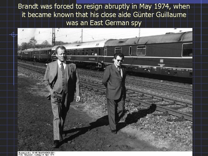 Brandt was forced to resign abruptly in May 1974, when it became known that his close aide Günter Guillaume was an East German spy