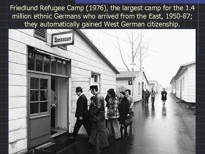 Friedlund Refugee Camp (1976), the largest camp for the 1. 4 million ethnic Germans who arrived from the East, 1950 -87; they automatically gained West German citizenship.