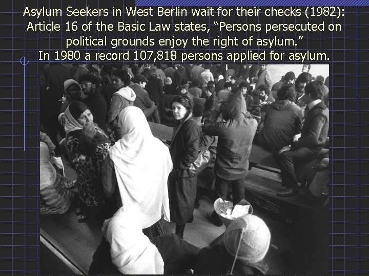 Asylum Seekers in West Berlin wait for their checks (1982): Article 16 of the Basic Law states, “Persons persecuted on political grounds enjoy the right of asylum. ” In 1980 a record 107, 818 persons applied for asylum.