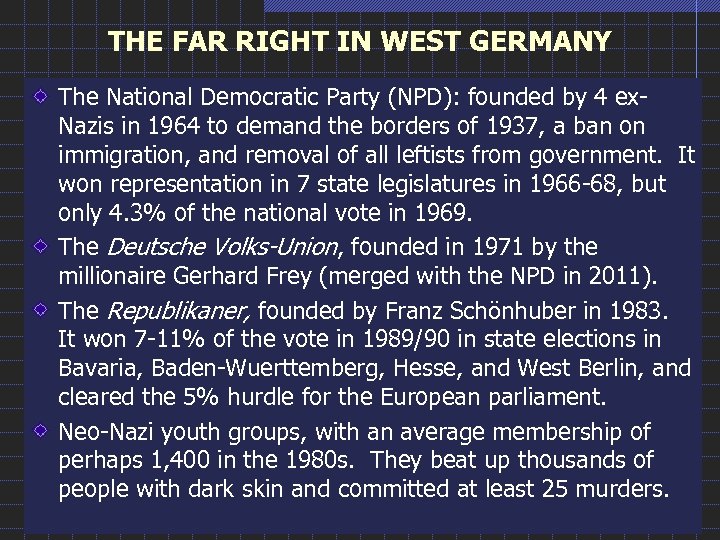 THE FAR RIGHT IN WEST GERMANY The National Democratic Party (NPD): founded by 4 ex. Nazis in 1964 to demand the borders of 1937, a ban on immigration, and removal of all leftists from government. It won representation in 7 state legislatures in 1966 -68, but only 4. 3% of the national vote in 1969. The Deutsche Volks-Union, founded in 1971 by the millionaire Gerhard Frey (merged with the NPD in 2011). The Republikaner, founded by Franz Schönhuber in 1983. It won 7 -11% of the vote in 1989/90 in state elections in Bavaria, Baden-Wuerttemberg, Hesse, and West Berlin, and cleared the 5% hurdle for the European parliament. Neo-Nazi youth groups, with an average membership of perhaps 1, 400 in the 1980 s. They beat up thousands of people with dark skin and committed at least 25 murders.