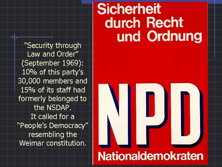 “Security through Law and Order” (September 1969): 10% of this party’s 30, 000 members and 15% of its staff had formerly belonged to the NSDAP. It called for a “People’s Democracy” resembling the Weimar constitution.