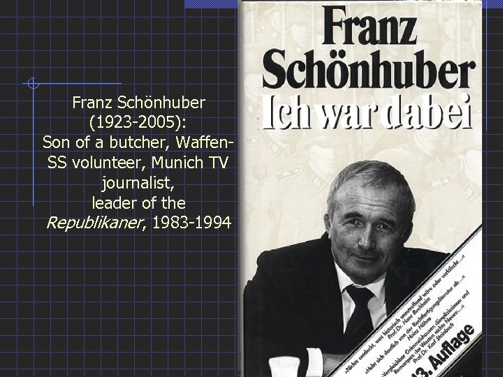 Franz Schönhuber (1923 -2005): Son of a butcher, Waffen. SS volunteer, Munich TV journalist, leader of the Republikaner, 1983 -1994