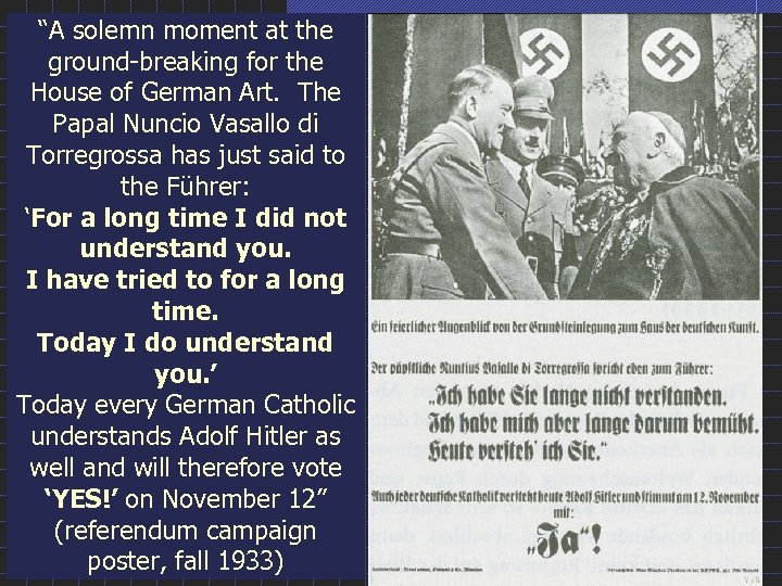 “A solemn moment at the ground-breaking for the House of German Art. The Papal Nuncio Vasallo di Torregrossa has just said to the Führer: ‘For a long time I did not understand you. I have tried to for a long time. Today I do understand you. ’ Today every German Catholic understands Adolf Hitler as well and will therefore vote ‘YES!’ on November 12” (referendum campaign poster, fall 1933)