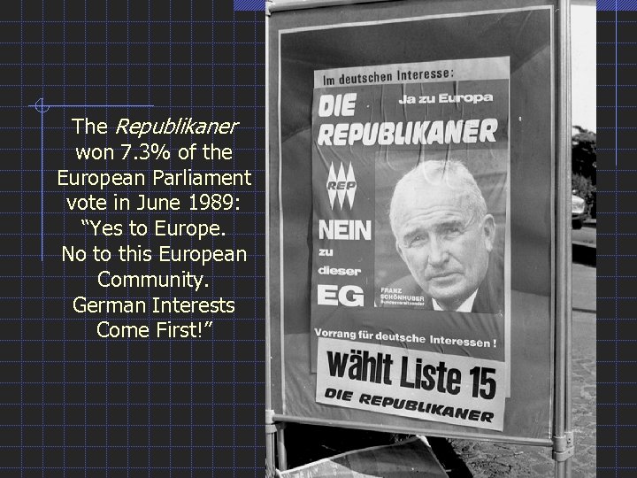 The Republikaner won 7. 3% of the European Parliament vote in June 1989: “Yes to Europe. No to this European Community. German Interests Come First!”