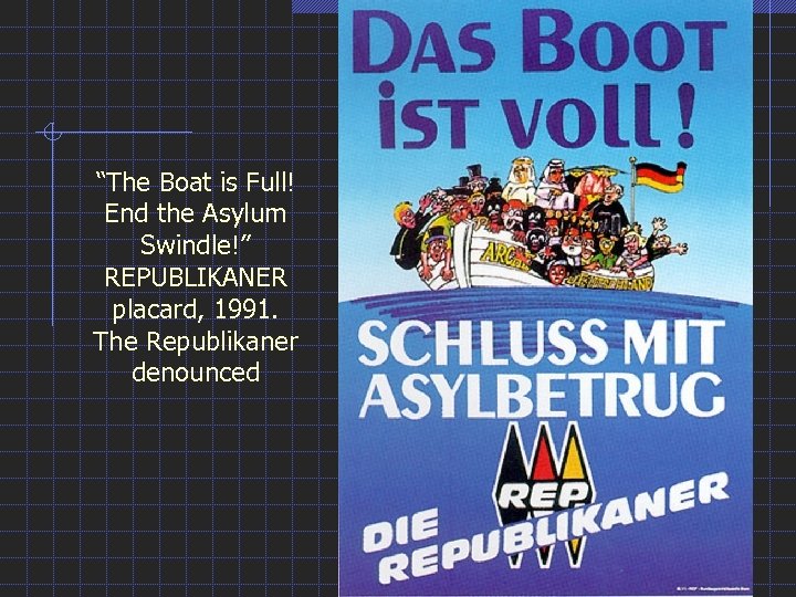 “The Boat is Full! End the Asylum Swindle!” REPUBLIKANER placard, 1991. The Republikaner denounced