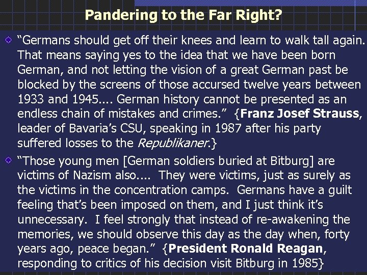 Pandering to the Far Right? “Germans should get off their knees and learn to walk tall again. That means saying yes to the idea that we have been born German, and not letting the vision of a great German past be blocked by the screens of those accursed twelve years between 1933 and 1945. . German history cannot be presented as an endless chain of mistakes and crimes. ” {Franz Josef Strauss, leader of Bavaria’s CSU, speaking in 1987 after his party suffered losses to the Republikaner. } “Those young men [German soldiers buried at Bitburg] are victims of Nazism also. . They were victims, just as surely as the victims in the concentration camps. Germans have a guilt feeling that’s been imposed on them, and I just think it’s unnecessary. I feel strongly that instead of re-awakening the memories, we should observe this day as the day when, forty years ago, peace began. ” {President Ronald Reagan, responding to critics of his decision visit Bitburg in 1985}