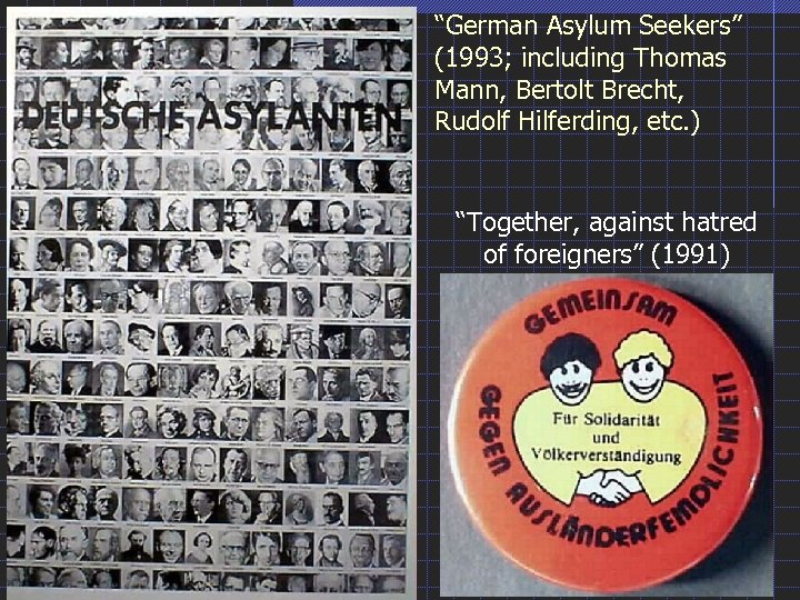 “German Asylum Seekers” (1993; including Thomas Mann, Bertolt Brecht, Rudolf Hilferding, etc. ) “Together, against hatred of foreigners” (1991)