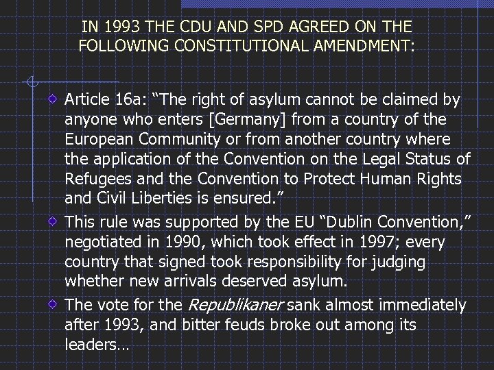 IN 1993 THE CDU AND SPD AGREED ON THE FOLLOWING CONSTITUTIONAL AMENDMENT: Article 16 a: “The right of asylum cannot be claimed by anyone who enters [Germany] from a country of the European Community or from another country where the application of the Convention on the Legal Status of Refugees and the Convention to Protect Human Rights and Civil Liberties is ensured. ” This rule was supported by the EU “Dublin Convention, ” negotiated in 1990, which took effect in 1997; every country that signed took responsibility for judging whether new arrivals deserved asylum. The vote for the Republikaner sank almost immediately after 1993, and bitter feuds broke out among its leaders…