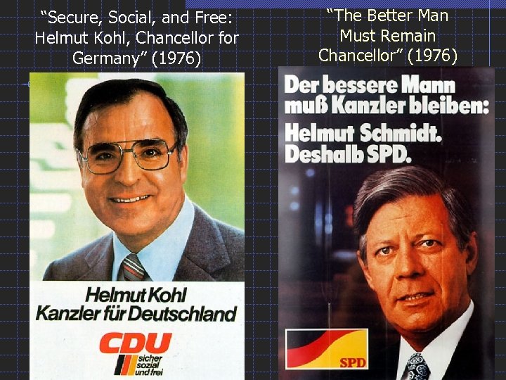 “Secure, Social, and Free: Helmut Kohl, Chancellor for Germany” (1976) “The Better Man Must Remain Chancellor” (1976)