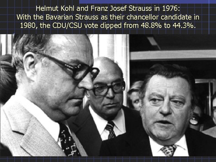 Helmut Kohl and Franz Josef Strauss in 1976: With the Bavarian Strauss as their chancellor candidate in 1980, the CDU/CSU vote dipped from 48. 8% to 44. 3%.