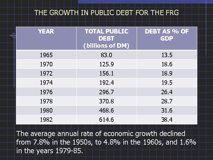 THE GROWTH IN PUBLIC DEBT FOR THE FRG YEAR TOTAL PUBLIC DEBT (billions of DM) DEBT AS % OF GDP 1965 83. 0 13. 5 1970 125. 9 18. 6 1972 156. 1 18. 9 1974 192. 4 19. 5 1976 296. 7 26. 4 1978 370. 8 28. 7 1980 468. 6 31. 6 1982 614. 6 38. 4 The average annual rate of economic growth declined from 7. 8% in the 1950 s, to 4. 8% in the 1960 s, and 1. 6% in the years 1979 -85.