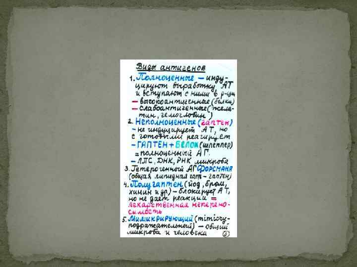 Виды антигенов 1. Полноценные – индуцируют выработку АТ и вступают с ними в реакции Высокоантигенные (белки) Слабоантигенные (желатин, гемоглобин) 2. Неполноценные (гаптен) Не индуцирует АТ, но с готовыми реагирует Гаптен + Белок (шлеппер) = полноценный АГ. ЛПС, ДНК, РНК микроба 3. Гетерогенные АГ Форсмана (общая липидная часть – гаптен) 4. Полугаптен (йод, бром, химин и др. ) – блокирует АТ, но не дает реакции = лекарственная непереносимость 5. Мимикрирующий (mimicry-подражательный) – общий микроба и человека