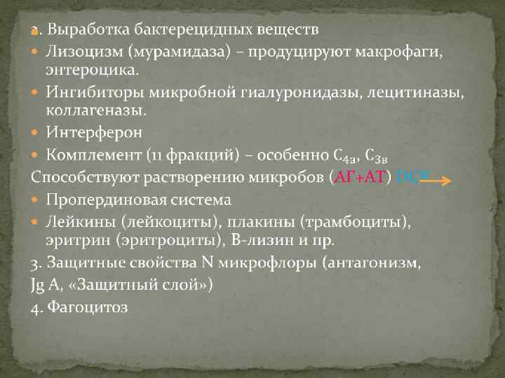 Неспецифические факторы защиты организма Это комплекс факторов сопротивляемости инфекционным агентам, существующих в организме, не зависимо от того попал микроб в организм или нет. Факторы: 1. Защитные свойства кожи, слизистых механическая защита, выведение с мочей, калом, мокротой, желочным соком перистальтика, выделение перекиси, молочной кислоты.