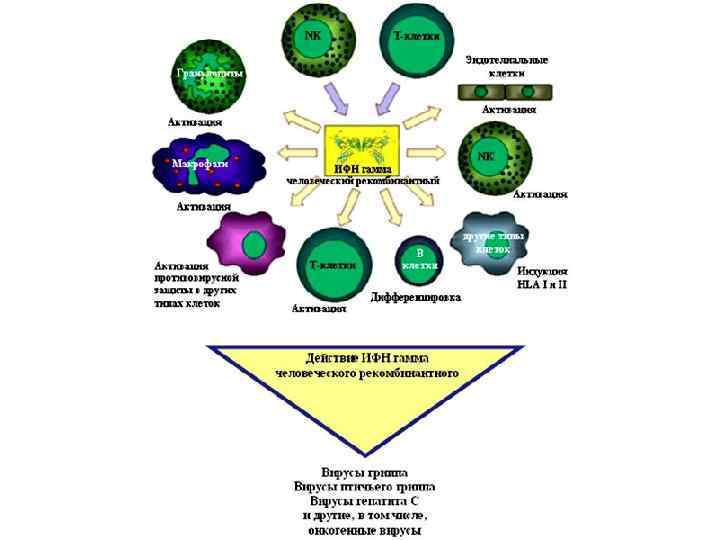 Интерферон • α –интерферон лейкоциты • β - интерферон фибробласты • γ - интерферон – Тлимфоциты, макрофаги, ЕК. • Механизм действия: связывается с рецепторами клетки и блокирует синтез белка в клетке (препятствует размножению вирусов)