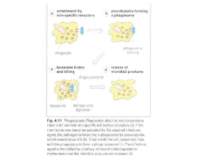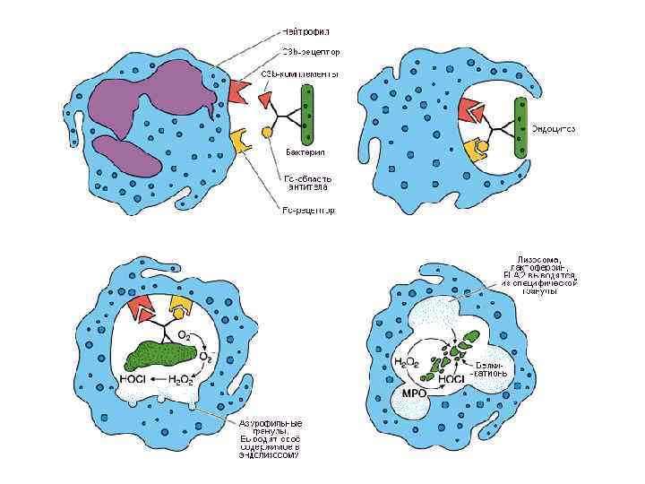 Этапы фагоцитоза 1. 2. 3. 4. 5. Активация и хемотаксис Адгезия (прикрепление) частиц к поверхности фагоцита Поглощение частиц, их погружение в цитоплазму и формирование фагосомы Образование фаголизосомы Внутриклеточный киллинг и переваривание – активация лизосомальных гранул (кислороднезависимая бактерицидность), усиление потребления кислорода и глюкозы – окислительный взрыв с образованием токсических метаболитов кислорода и азота (перекись водорода, супероксиданион кислорода, гипохлорная кислота, пироксинитрит) – кислородзависимая система бактерицидности.