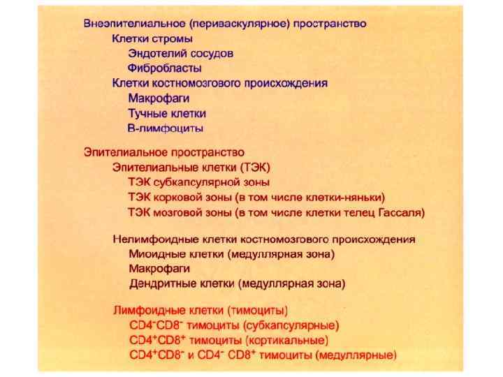 Тимус • Гистогенетически тимус - трёхслойный орган. • 1) соединительнотканная строма, формирующая трабекулы, сосудистую сеть и периваскулярное пространство; • 2) эпителиальный ретикулум, формирующий эпителиальное пространство, • 3) заселяющие его лимфоидные клетки тимоциты, и другие клетки костно-мозгового происхождения (ДК, МФ, миоидные клетки), дифференцирующиеся в тимусе.