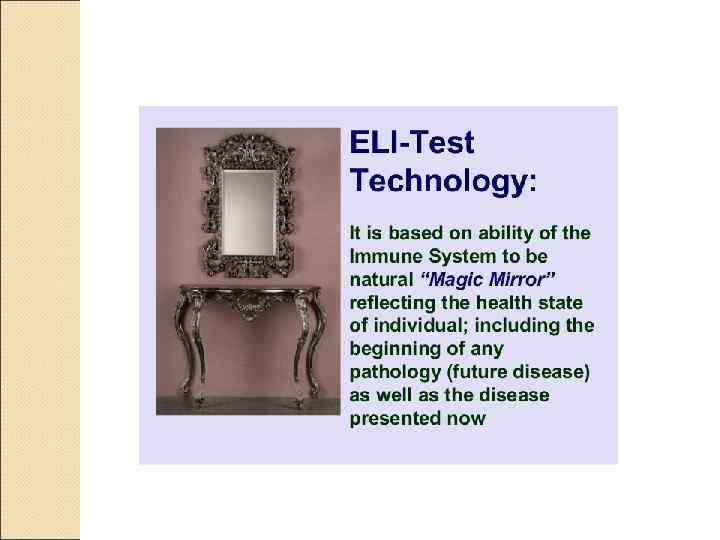 Технология ЭЛИ-Тест позволяет: Провести раннюю диагностику многих нарушений в вашем организме, задолго до появления первых симптомов болезни; Провести раннюю диагностику уже имеющихся или только начинающихся заболеваний у взрослых и детей; Уточнить диагноз в сложных случаях; Оценить и спрогнозировать течение беременности на ранних сроках. Помогать в решении проблем бесплодия, угрозы выкидыша, рождения здорового ребенка; Индивидуально подобрать наиболее эффективное лечение имеющихся заболеваний и снизить риски развития многих осложнений за счет своевременного выявления патологии; Оценить индивидуальную эффективность проведенного лечения; Оценит иммунную реактивность организма часто и длительно болеющих детей и взрослых.