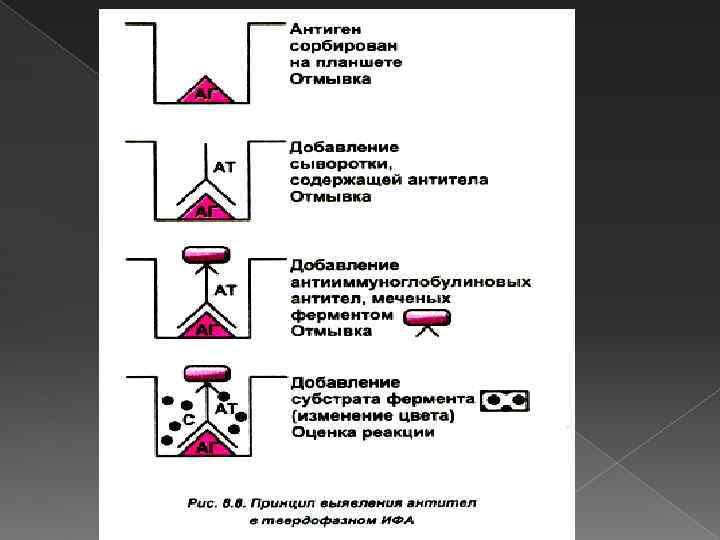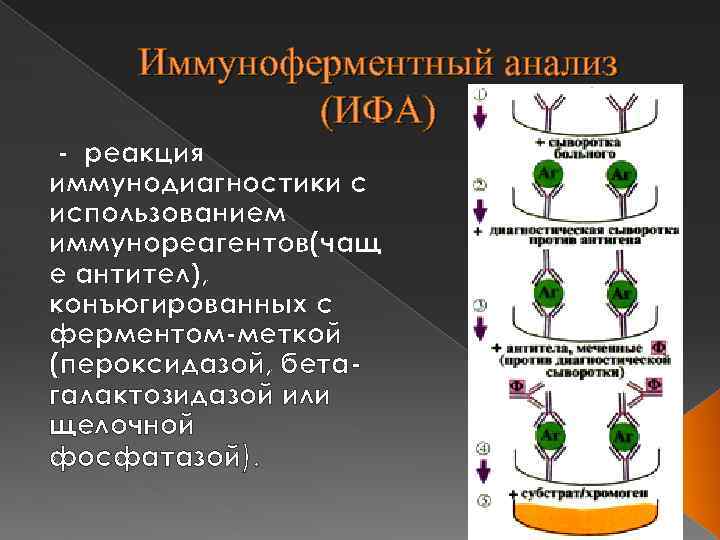 Иммуноферментный анализ (ИФА) - реакция иммунодиагностики с использованием иммунореагентов(чащ е антител), конъюгированных с ферментом-меткой (пероксидазой, бетагалактозидазой или щелочной фосфатазой).