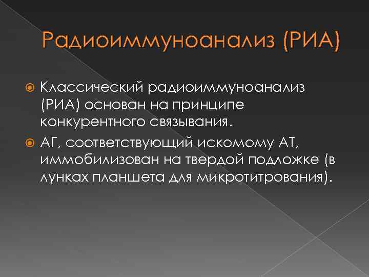 Радиоиммуноанализ (РИА) Классический радиоиммуноанализ (РИА) основан на принципе конкурентного связывания. АГ, соответствующий искомому АТ, иммобилизован на твердой подложке (в лунках планшета для микротитрования).