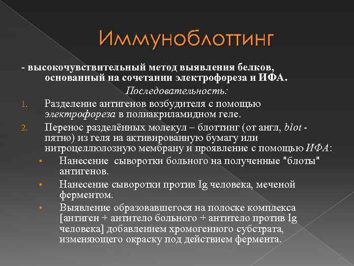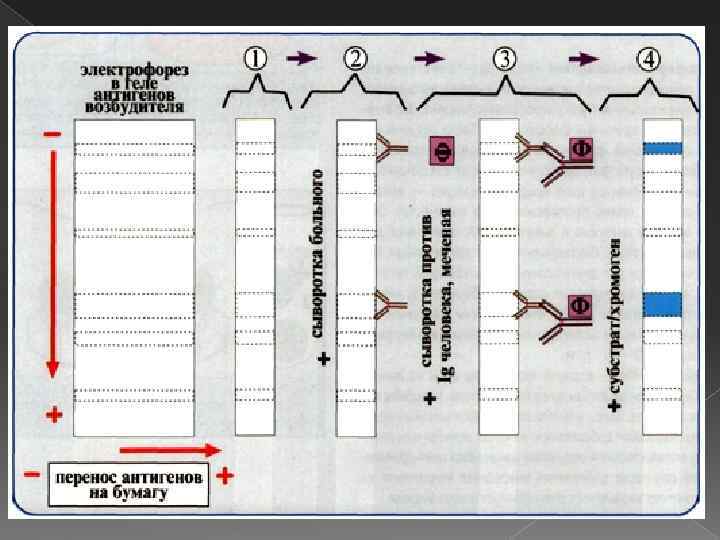 Иммуноблоттинг - высокочувствительный метод выявления белков, основанный на сочетании электрофореза и ИФА. Последовательность: 1. Разделение антигенов возбудителя с помощью электрофореза в полиакриламидном геле. 2. Перенос разделённых молекул – блоттинг (от англ, blot пятно) из геля на активированную бумагу или нитроцеллюлозную мембрану и проявление с помощью ИФА: • Нанесение сыворотки больного на полученные "блоты" антигенов. • Нанесение сыворотки против Ig человека, меченой ферментом. • Выявление образовавшегося на полоске комплекса [антиген + антитело больного + антитело против Ig человека] добавлением хромогенного субстрата, изменяющего окраску под действием фермента.
