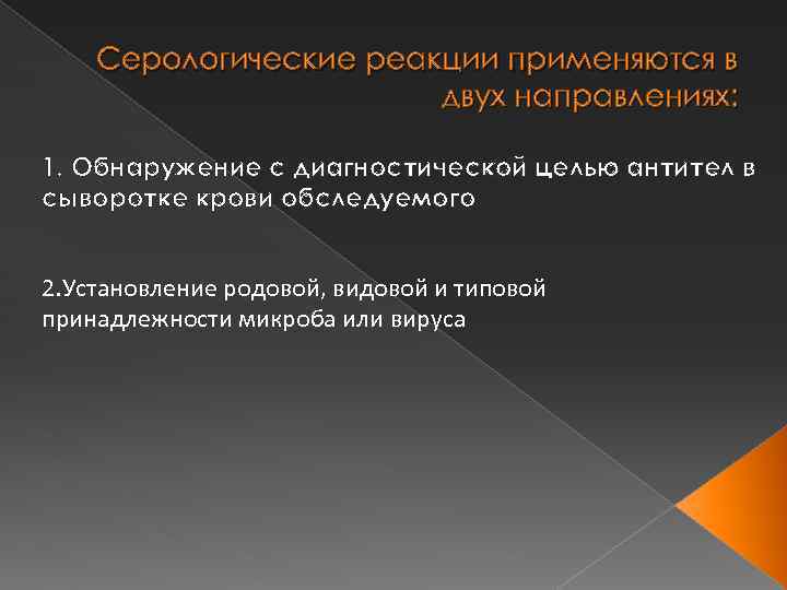 Серологические реакции применяются в двух направлениях: 1. Обнаружение с диагностической целью антител в сыворотке крови обследуемого 2. Установление родовой, видовой и типовой принадлежности микроба или вируса