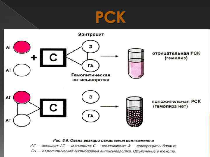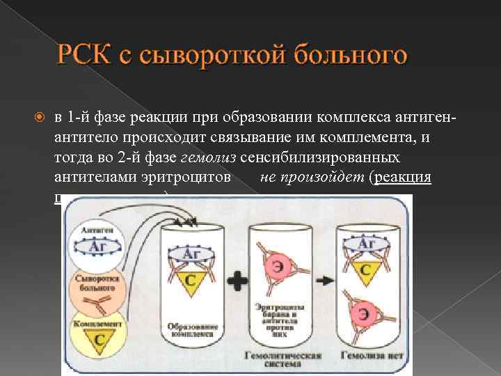 РСК с сывороткой больного в 1 -й фазе реакции при образовании комплекса антигенантитело происходит связывание им комплемента, и тогда во 2 -й фазе гемолиз сенсибилизированных антителами эритроцитов не произойдет (реакция положительная).