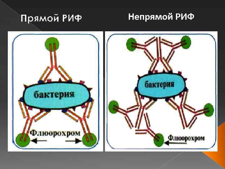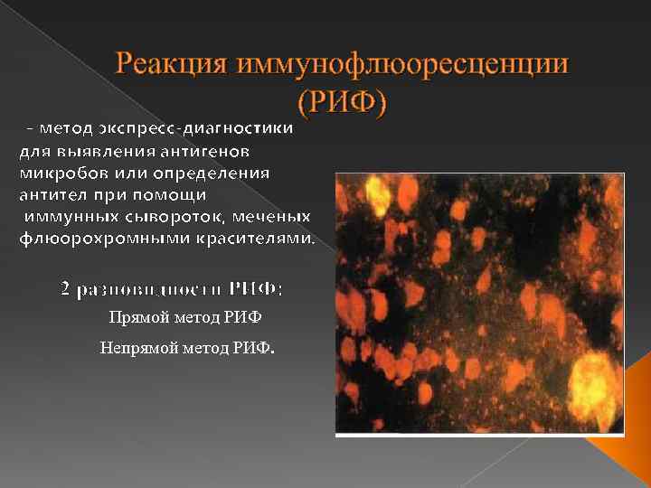 Реакция иммунофлюоресценции (РИФ) - метод экспресс-диагностики для выявления антигенов микробов или определения антител при помощи иммунных сывороток, меченых флюорохромными красителями. 2 разновидности РИФ: Прямой метод РИФ Непрямой метод РИФ.
