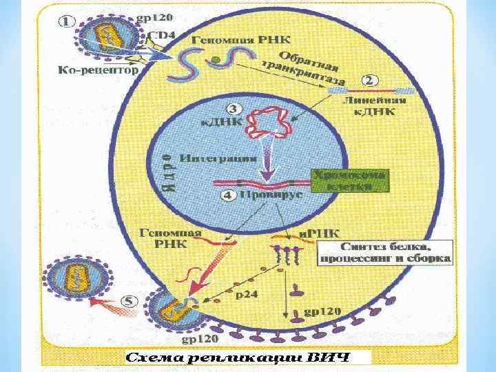*Специфически адсорбируясь на поверхности клеток- мишеней, ВИЧ сливается с их мембраной, освобождается от оболочки и проникает внутрь клетки, где осуществляет переписку ревертаза. *Этапы: *1. Взаимодействие рецептора вируса с белком СД 4 клетки- мишени. 2. Депротеинизация и проникновение в клетку. 3. Обратная транскрипция ( 4 стадии) *Жизненный цикл вируса
