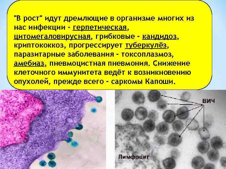 "В рост" идут дремлющие в организме многих из нас инфекции - герпетическая, цитомегаловирусная, грибковые - кандидоз, криптококкоз, прогрессирует туберкулёз, паразитарные заболевания - токсоплазмоз, амебиаз, пневмоцистная пневмония. Снижение клеточного иммунитета ведёт к возникновению опухолей, прежде всего - саркомы Капоши.