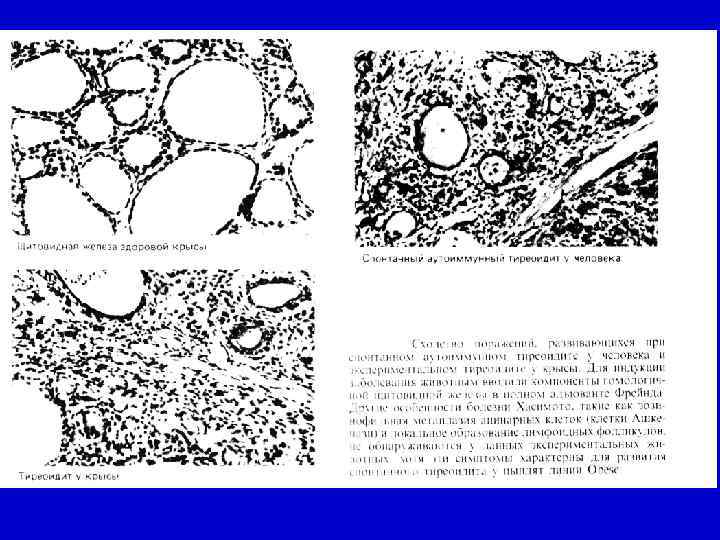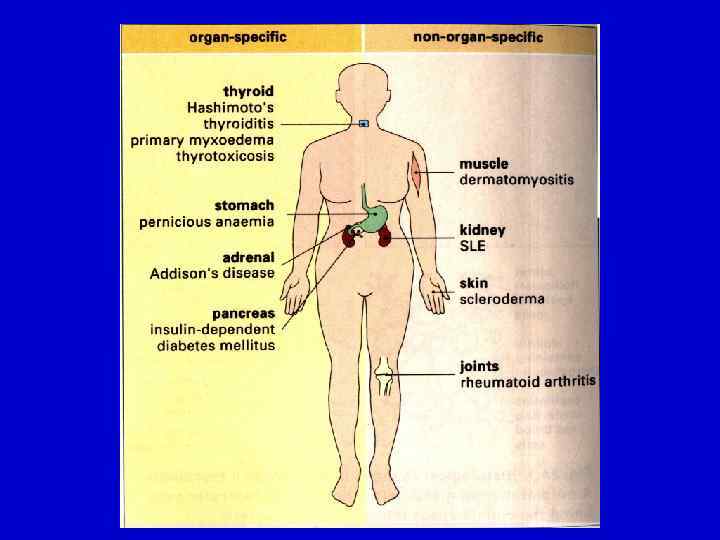 Нарушения Широко распространенные аутоиммунные заболевания Тироидит Хашимото Болезнь Грейва (Базедова болезнь) Системная красная волчанка Синдром Гудпастчера Аутоиммунная тромбоцитопения Аутоиммунный атрофический гастрит со злокачественной анемией Myasthenia gravis Ткань – мишень Инсулинозависимый сахарный диабет Ревматоидный артрит Системный склероз Тироидные железы Щитовидка, глаза, кожа Полиорганная патология Легкие, почки Тромбоциты Слизистая желудка Ацетилхолиновый рецептор Островки Лангерганса Полиорганная патология Синдром Шагрена Полимиозиты – дерматомиозиты Хронический активный гепатит Язвенные колиты Первичный цирроз желчных протоков Полиорганная патология Мыщцы, кожа Печень Тонкий кишечник Печень