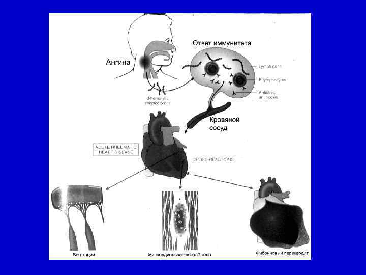 Механизмы аутоаллергических реакций (по: В. А. Черешнев, Б. Г. Юшков) чужой антиген антитело свой антиген антитело Такого типа реакцию можно наблюдать при ревматизме. В стрептококках группы А существуют антигены цитоплазматической мембраны, перекрестно реагирующие с элементами сосудистой стенки, а также с полисахаридной и гликопротеиновой фракциями сердечных клапанов и аорты.