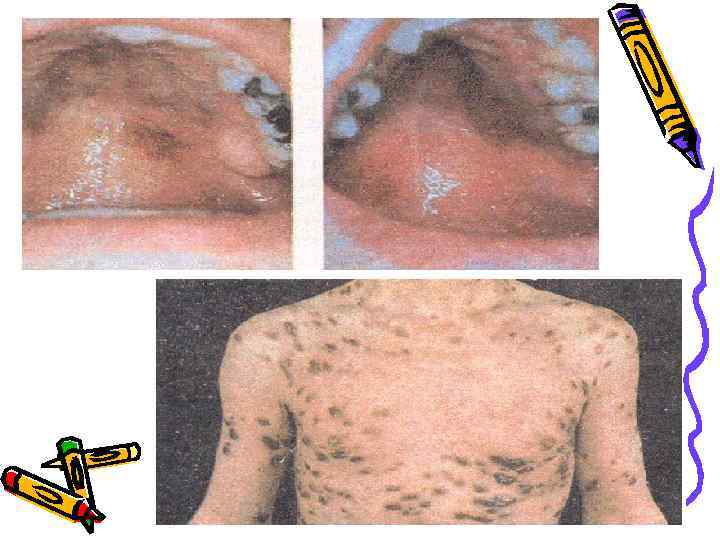 • Капоши саркомасының ең негізгі көріністері – терісіндегі өзгерістер. Жиі кездесетіндері – дақ, түйіндақ, түйіндер және ісіктер. • Көбінесе көлемі түйіннен 10 теңгелік тиынға дейін болатын қызғылт-көк немесе кызғылтбоз дақтармен сипатталады.