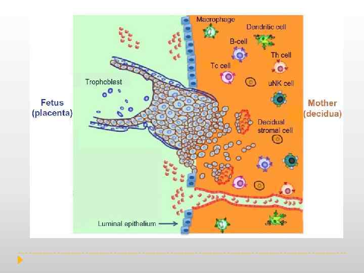During normal pregnancy, the human decidua contains a high number of immune cells, such as macrophages, natural killer (NK) cells and regulatory T cells (Treg). 70% of decidual leukocytes are NK cells, 20– 25% are macrophages and 1. 7% are dendritic cells. From the adaptive immune system, B cells are absent, but T lymphocytes constitute about 3– 10% of the decidual immune cells. During the first trimester, NK cells, dendritic cells and macrophages infiltrate the decidua and accumulate around the invading trophoblast cells. Deletion of either macrophages, NK cells or dendritic cells (DC) has deleterious effects. Elegant studies have shown that in the absence of NK cells, trophoblast cells are not able to reach the endometrial vascularity leading to termination of the pregnancy. These studies suggest that u. NK cells are critical for trophoblast invasion in the uterus. Similarly, depletion of DCs prevented blastocyst implantation and decidual formation. Indeed, this study suggests that u. DC are necessary for decidual formation and may affect the angiogenic response by inhibiting blood vessel maturation. These data further support the idea that the fetal–maternal immune interaction is more complex than the comparison to transplant allograft. Consequently, the presence of immune cells at the implantation site is not associated with a response to the ‘foreign’ fetus but to facilitate and protect the pregnancy. Therefore, the immune system at the implantation site is not suppressed, on the contrary it is active, functional and is carefully controlled.