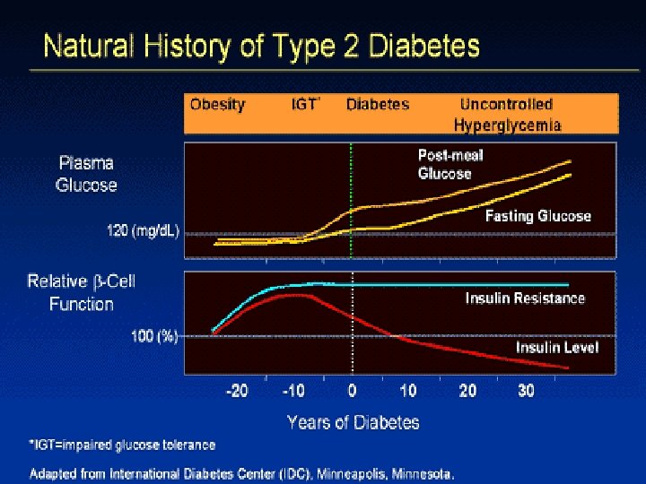 Development of Type 2 Diabetes I II III Fasting Glucose IV V Hyperglycemia Glucose Tolerance Abnormal glucose tolerance Insulin Sensitivity Decreased insulin sensitivity Insulin Secretion Hyperinsulinemia, the -cell failure Normal IGT Type 2 Diabetes