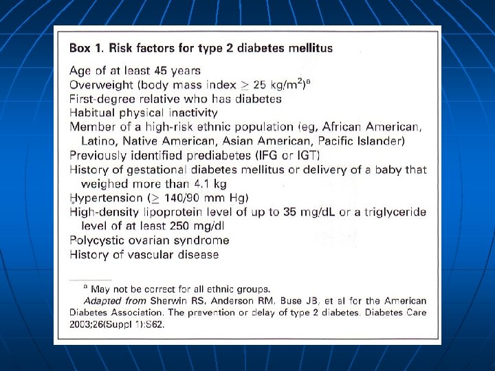 Studies that Confirm the Strong Genetic Basis of Type 2 DM Twin studies Familial aggregation High prevalence population Genetic Admixture studies Prevalence in different ethnic groups in same environment MODY/Nauruans/Pimas – autosomal dominant inheritance