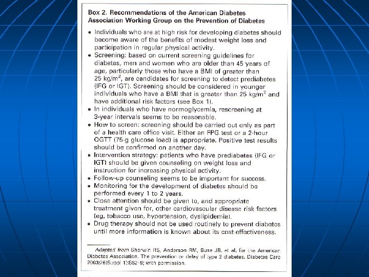 Preventing Type 2 DM Evidence that it is possible Primate studies of Type 2 DM Prevention of coronary artery disease Reversion to traditional life-style Rural-urban studies of risk factors Influence of physical activity Type 2 DM prevalence and incidence